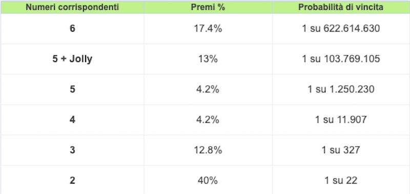 L’ultima edizione in cui è stato centrato il fatidico 6 è stato il 23 giugno del 2018 con la bellezza di 51,3 milioni distribuiti in tutta Italia grazie a un sistema da 45 quote, mentre il 17 aprile l’imponente somma di 130,2 milioni era finiti in Sicilia e precisamente a Caltanissetta.