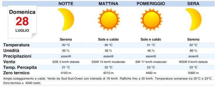 A Roma domenica 28 luglio, cieli in prevalenza sereni o poco nuvolosi per l’intera giornata. Durante la giornata la temperatura massima registrata sarà di 32°C, la minima di 20°C, lo zero termico si attesterà a 4500m. I venti saranno al mattino assenti o deboli e proverranno da Sudest, al pomeriggio moderati e proverranno da Sudovest. Allerte meteo previste: afa.