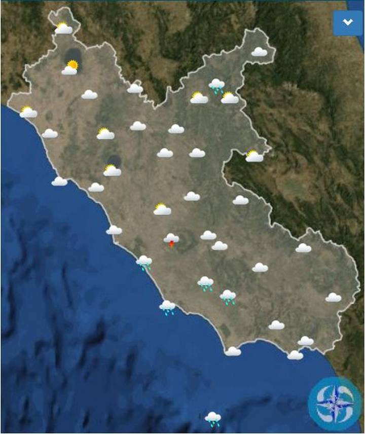 In provincia di Roma: Al mattino Coperto con pioggia debole intermittente, al pomeriggio Coperto con pioggia debole, la sera Nubi sparse con possibili piovaschi, la notte Coperto con possibili pioviggini.