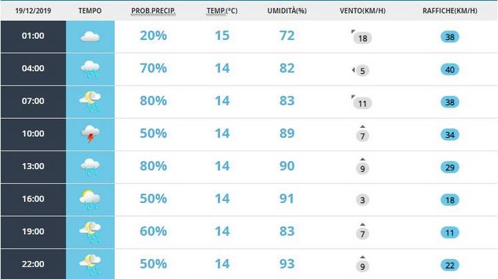 A Napoli giovedì 19 dicembre oggi cieli molto nuvolosi o coperti al mattino con piogge e rovesci anche temporaleschi, in temporanea attenuazione nel pomeriggio, sono previsti 14mm di pioggia. Durante la giornata di oggi la temperatura massima registrata sarà di 18°C, la minima di 13°C, lo zero termico si attesterà a 2150m. I venti saranno al mattino deboli e proverranno da Est, al pomeriggio deboli e proverranno da Est-Sudest. Mare mosso. Nessuna allerta meteo presente.