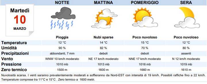 A Palermo oggimartedì 10 marzo cieli molto nuvolosi o coperti al mattino con piogge e rovesci anche temporaleschi, in attenuazione dal pomeriggio. schiarite in serata, sono previsti 12mm di pioggia. Durante la giornata di oggila temperatura massima registrata sarà di 15°C, la minima di 11°C, lo zero termico si attesterà a 1600m. I venti saranno al mattino moderati e proverranno da Est-Nordest, al pomeriggio moderati e proverranno da Nordest. Mare mosso. Allerte meteo previste: pioggia.