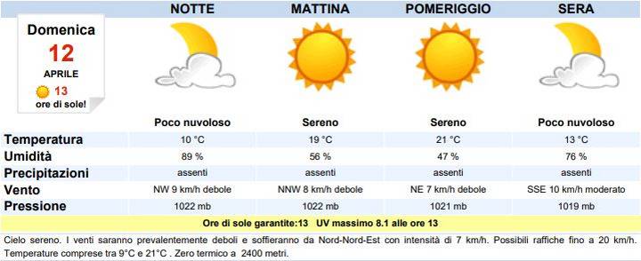 Segnaliamo che la nostra redazione Meteo, effettua l’aggiornamento delle previsioni meteo dettagliate ogni ora per i prossimi giorni in Italia e nelle zone locali.