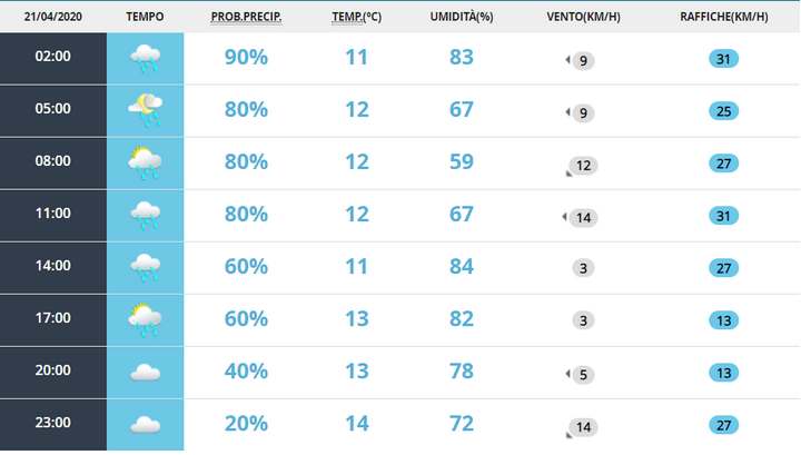 A Ravenna oggi martedì 21 aprile oggi cieli molto nuvolosi o coperti con deboli piogge per l’intera giornata, sono previsti 3.5mm di pioggia. Durante la giornata di oggi la temperatura massima registrata sarà di 14°C, la minima di 13°C, lo zero termico si attesterà a 2563m. I venti saranno al mattino tesi e proverranno da Est-Nordest, al pomeriggio moderati e proverranno da Est-Nordest. Nessuna allerta meteo presente.