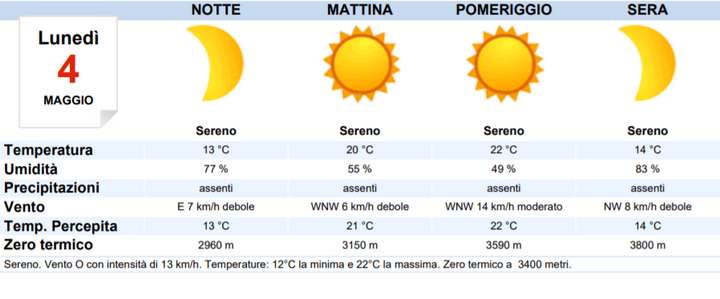 A Latina lunedì 4 maggio oggi cieli in prevalenza sereni o poco nuvolosi per l’intera giornata, non sono previste piogge. Durante la giornata di dopooggi la temperatura massima registrata sarà di 22°C, la minima di 11°C, lo zero termico si attesterà a 3354m. I venti saranno al mattino moderati e proverranno da Ovest, al pomeriggio moderati e proverranno da Ovest-Sudovest. Mare poco mosso. Nessuna allerta meteo presente.