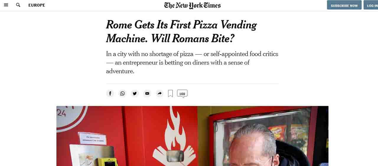 «I romani mangiano sempre la pizza – ha scritto Elisabetta Povoledo sul New York Times – A pranzo fanno la pizza al taglio, tagliata con le forbici della misura desiderata e farcita con condimenti. Fanno merenda con la pizza bianca, senza niente sopra, o con la pizza rossa, con solo salsa di pomodoro, o con le pizzette. La “Pizza scrocchiarella”, crosta tonda e sottile, quella che gli americani potrebbero riconoscere meglio, è quasi sempre riservata alla cena. In sostanza, i romani mangeranno la pizza, qua e là, la mangeranno ovunque. Ma potrebbero mangiarla da un distributore automatico? Massimo Bucolo, è ottimista, lui scommette che lo faranno».