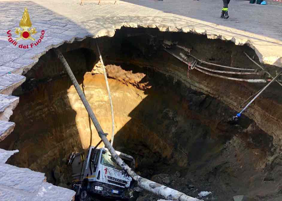 Una voragine “mostruosa” dalle dimensioni apocalittiche, sta interessando la zona antistante la Basilica di San Mauro in Largo San Mauro, a Casoria, in provincia di Napoli. Il buco è profonda e largo decine di metri. Nella voragine è precipitato un compattatore che raccoglie rifiuti dai cassonetti. L’autista è stato recuperato dai vigili del fuoco, al momento è stato trasportato in ospedale per accertamenti.