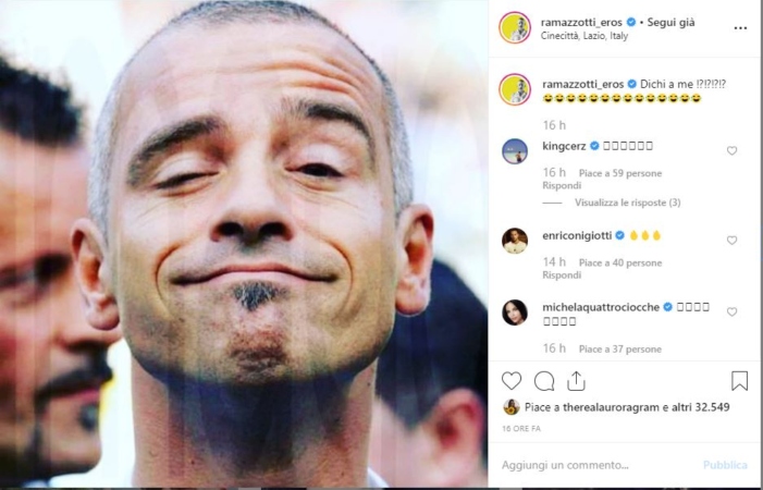 Poi prima sempre su Instagram ha pubblicato una foto, un suo primo piano, con una smorfia dedicata alla sua ex Marica Pellegrini. Una sorta di commento alle foto pubblicate dal settimanale Chi, che ritrae Marica Pellegrini e Charley Vezza mentre si baciano. Nella foto Ramazzotti commenta con una “Dichi a me?”, che significa in dialetto romanesco “Dici a me?” e il commento con tante faccine che ridono. E tra i like c’è pure proprio quello della sua ex.