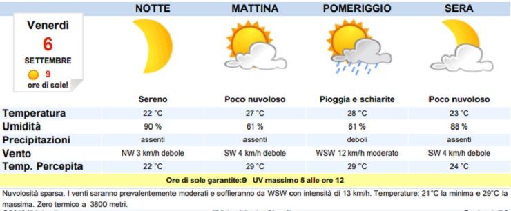 Segnaliamo che la nostra redazione Meteo, effettua l’aggiornamento delle previsioni meteo dettagliate ogni ora per i prossimi giorni in Italia e nelle zone locali.