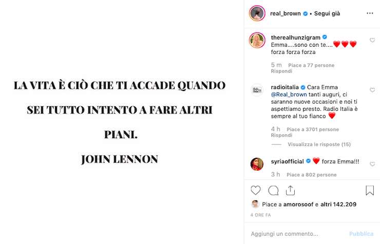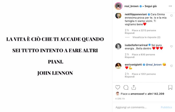 A commentare il post di Emma è stato anche Nek: “Cara Emma ennesima prova per te. Io e la mia famiglia ti siamo vicini. Ti vogliamo bene”. Subito dopo anche Laura Pausini ha manifestato il suo affetto: “Siamo tutti con te. Forza”. In fine troviamo anche Isabella Ferrari: “Sei pura energia. Bella dentro”.