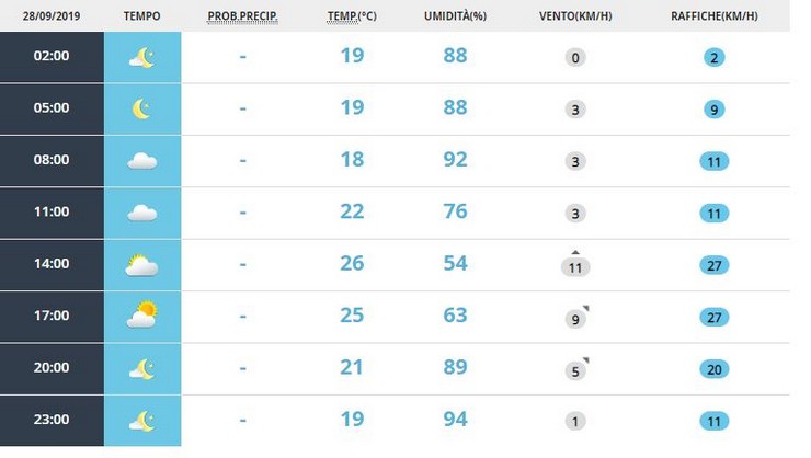 A Roma sabato 28 settembre domani cieli in prevalenza poco nuvolosi per l’intera giornata. Durante la giornata di domani la temperatura massima registrata sarà di 27°C, la minima di 16°C, lo zero termico si attesterà a 4150m. I venti saranno al mattino deboli e proverranno da Est-Sudest, al pomeriggio deboli e proverranno da Sudovest. Nessuna allerta meteo presente.