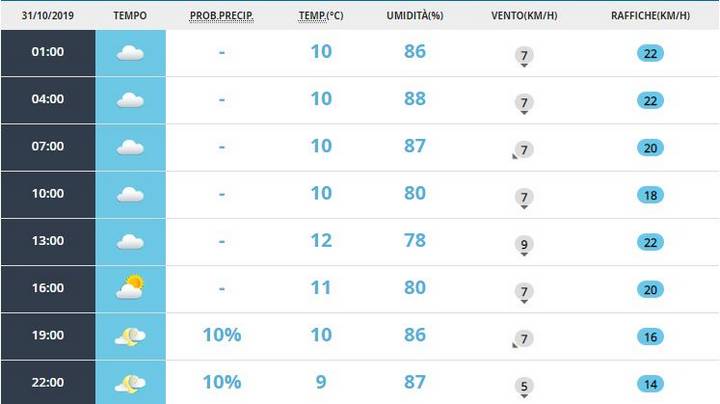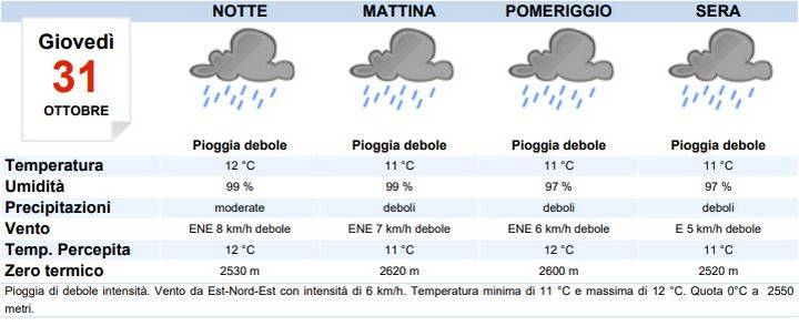 A Torino domani giovedì 31 ottobre cieli molto nuvolosi o coperti per tutto l’arco della giornata, con deboli piogge dal pomeriggio, sono previsti 2.8mm di pioggia. Durante la giornata di domani la temperatura massima registrata sarà di 12°C, la minima di 11°C, lo zero termico si attesterà a 2250m. I venti saranno al mattino deboli e proverranno da Nordest, al pomeriggio deboli e proverranno da Nordest. Nessuna allerta meteo presente.