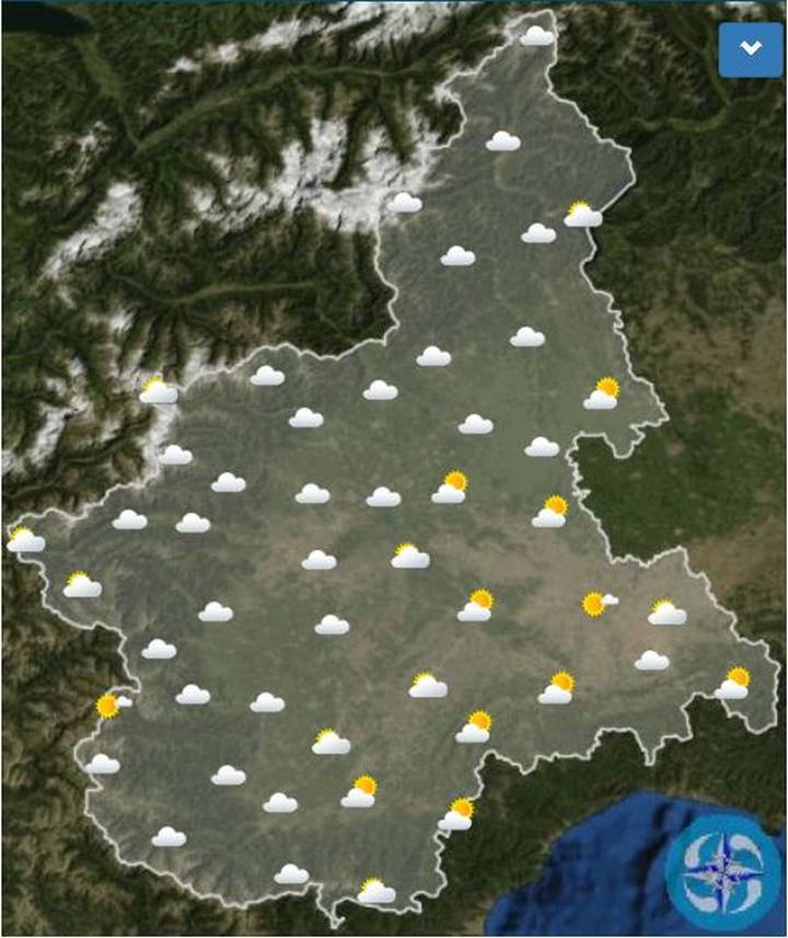 In provincia di Torino: al mattino Molto nuvoloso o coperto, al pomeriggio Nubi sparse e schiarite, la sera Molto nuvoloso o coperto, la notte Molto nuvoloso o coperto.