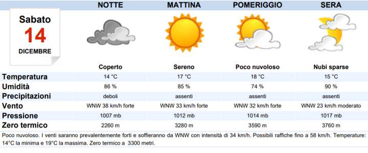 A Cagliari domani sabato 14 dicembre cieli molto nuvolosi o coperti con piogge e rovesci anche temporaleschi. in serata attenuazione dei fenomeni, sono previsti 16mm di pioggia. Durante la giornata di domani la temperatura massima registrata sarà di 19°C, la minima di 14°C, lo zero termico si attesterà a 3300m. I venti saranno al mattino moderati e proverranno da Nordovest, al pomeriggio moderati e proverranno da Nord-Nordovest. Mare mosso. Allerte meteo previste: vento.