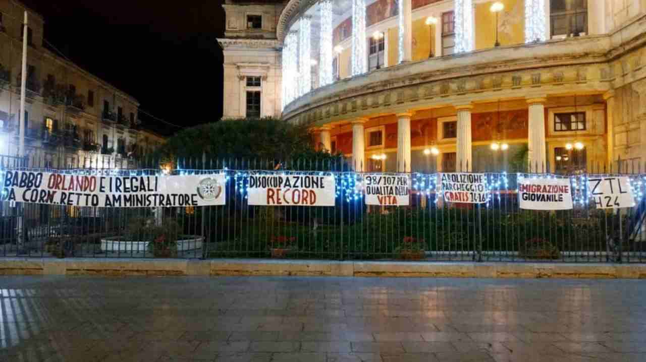 Gli striscioni sono stati appesi davanti al teatro Politeama di Palermo. Su di essi si leggono alcuni provvedimenti presi dallo stesso Orlando e dai suoi assessori, specialmente negli ultimi mesi. Il messaggio principale recita “Babbo Orlando e i regali da corn… corretto amministratore”. I militanti di Casapound fanno riferimento, nella parola “cornuto” interrotta, anche a un episodio di circa un anno fa, quando il primo cittadino si sentì dire questa parola da un palermitano che lo incontrò durante un evento organizzato da Coldiretti.