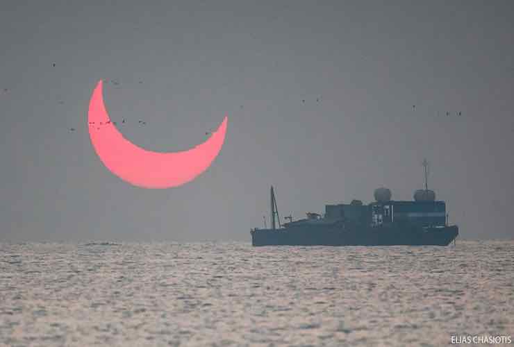 Tuttavia, all’inizio le condizioni meteo non sembravano delle migliori, “c’erano foschia e nuvole basse, Ero preoccupato che non sarebbe uscito nulla dall’eclissi. Tuttavia, quando finalmente il sole cominciò a sorgere, si è mostrato in due pezzi separati, con due corna rosse che perforavano il mare”.