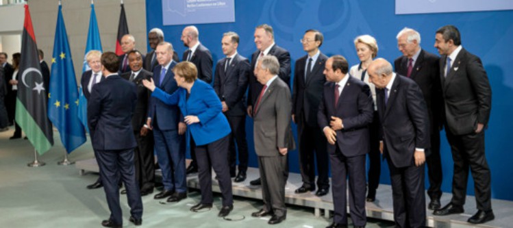 Foto di gruppo per iniziare la Conferenza internazionale sulla Libia a Berlino. A fare gli onori di casa la Merkel, Conte cerca la prima fila, invano.