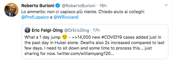 “Lo ammetto: non ci capisco più niente. Chiedo aiuto ai colleghi Pier Luigi Lopalco e Walter Ricciardi”: lo ha scritto sul suo profilo Twitter il virologo Roberto Burioni, riferendosi alla scelta delle autorità sanitarie della provincia cinese di Hubei, epicentro dell’epidemia di nuovo Coronavirus, di adottare un nuovo sistema di diagnosi, facendo così aumentare notevolmente il numero delle persone contagiate e delle vittime.