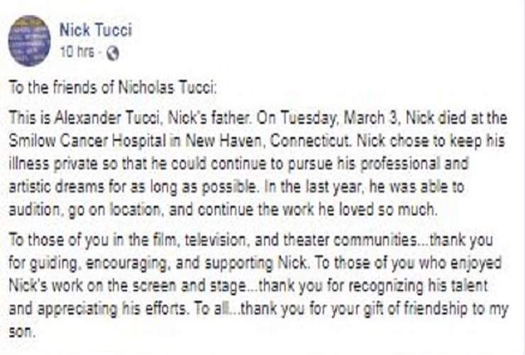 “Sono Alexander Tucci, il padre di Nick. Martedì 3 marzo Nick è morto all’ospedale Smilow Cancer di New Haven, nel Connecticut. Nick ha scelto di mantenere la sua malattia privata in modo da poter continuare a perseguire i suoi sogni professionali e artistici il più possibile. Nell’ultimo anno è stato in grado di fare audizioni, andare sul posto e continuare il lavoro che amava così tanto. A quelli di voi nelle comunità cinematografiche, televisive e teatrali … grazie per aver guidato, incoraggiato e supportato Nick. A quelli di voi che hanno apprezzato il lavoro di Nick sullo schermo e sul palcoscenico … grazie per aver incoraggiato il suo talento e apprezzato i suoi sforzi. A tutti…grazie per il dono di amicizia a mio figlio.”