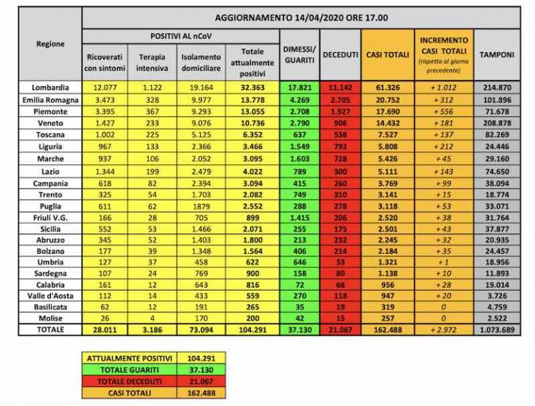 Il dato comprende vittime, persone attualmente malate e guariti. Il numero dei contagiati totali dal coronavirus in Italia – compresi morti e guariti – è di 162.488, con un incremento rispetto a ieri di 2.972.