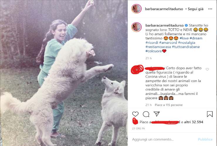 Lo ha dichiarato più volte Carmelita nel corso delle sue trasmissioni e di sue interviste a cuore aperto, che lei ama profondamente gli animali, in particolare i cani. E ieri- per l’ appunto- ha voluto ricordare con un post Social i suoi più grandi amici pelosi: Totto e Neve. E lo ha fatto postando uno scatto squisitamente vintage, certamente non digitale, dai colori autunnali, ove lei, giovanissima, forse poco più che adolescente, con una coda di cavallo e i capelli mossi e lunghissimi, e con indosso una tuta o un pigiama verde acqua,. si appresta a giocare con loro in giardino.