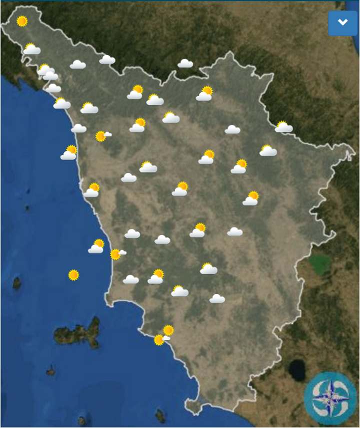 In provincia di Livorno: Anticiclone afro-mediterraneo disturbato da correnti settentrionali in quota. Giornata che partirà soleggiata pur con la possibilità di nubi basse tra notte e primo mattino lungo l’Arcipelago e le coste. Da metà mattinata aumentano le nubi su Appennino toscano, con qualche pioggia in tarda mattinata sui crinali; previsto nel pomeriggio il transito di un fronte nuvoloso associato a locale instabilità sul frusinate e a qualche locale piovasco su Ovest Toscana. Tra pomeriggio e sera rapido miglioramento con cieli in rasserenamento grazie all’entrata dei venti di Grecale. Temperature massime in calo sulle zone interne di Toscana e Umbria, stazionarie o in lieve aumento sulle zone centro-occidentali, specie del Lazio. Venti inizialmente variabili, in rotazione da Nordest nella seconda parte della giornata. Mare in prevalenza poco mosso.