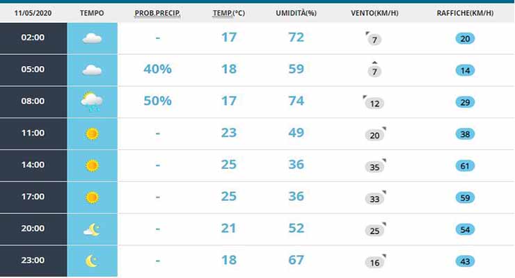 Segnaliamo che la nostra redazione Meteo, effettua l’aggiornamento delle previsioni meteo dettagliate ogni ora per i prossimi giorni in Italia e nelle zone locali.