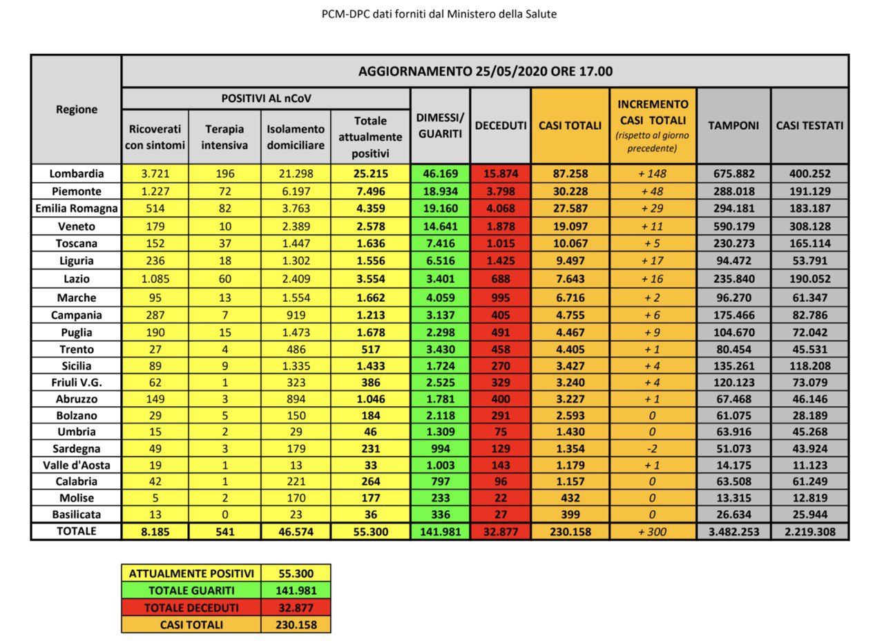 Ecco l’aggiornamento reso noto alle ore 18 di oggi lunedì 25 maggio, la Protezione Civile ha comunicato i dati dell’emergenza Coronavirus relativi alle ultime 24 ore.
