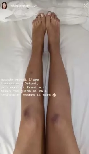 “Quando prendi l’ape turistica a Ostuni, si rompono i freni e il tizio che guida si va a schiantare contro il muro”, ha scritto la figlia di Giancarlo Magalli nelle sue Instagram story allegando la foto delle sue gambe piene di lividi.