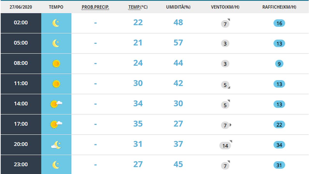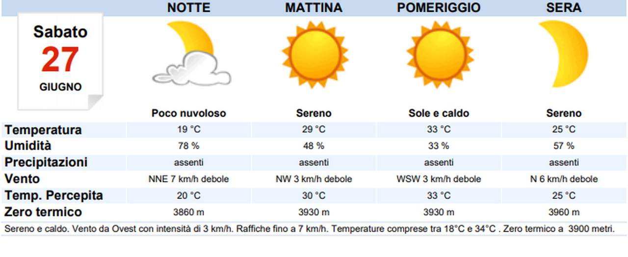 A Parma oggi sabato 27 giugno bel tempo con sole splendente per l’intera giornata, non sono previste piogge. Durante la giornata di oggi la temperatura massima registrata sarà di 34°C, la minima di 18°C, lo zero termico si attesterà a 3900m. I venti saranno al mattino deboli e proverranno da Ovest–Nordovest, al pomeriggio deboli e proverranno da Sudovest. Allerte meteo previste: afa.