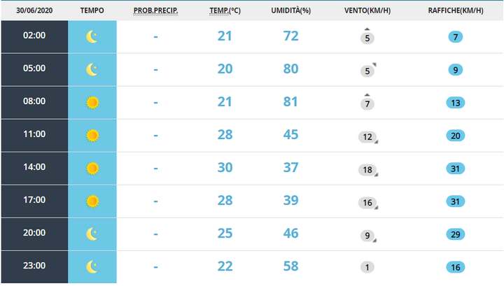 A Sassari oggi martedì 30 giugno oggi bel tempo con sole splendente per l’intera giornata, non sono previste piogge. Durante la giornata di dopooggi la temperatura massima registrata sarà di 31°C, la minima di 19°C, lo zero termico si attesterà a 4780m. I venti saranno al mattino moderati e proverranno da Ovest-Nordovest, al pomeriggio moderati e proverranno da Nord-Nordovest. Nessuna allerta meteo presente.