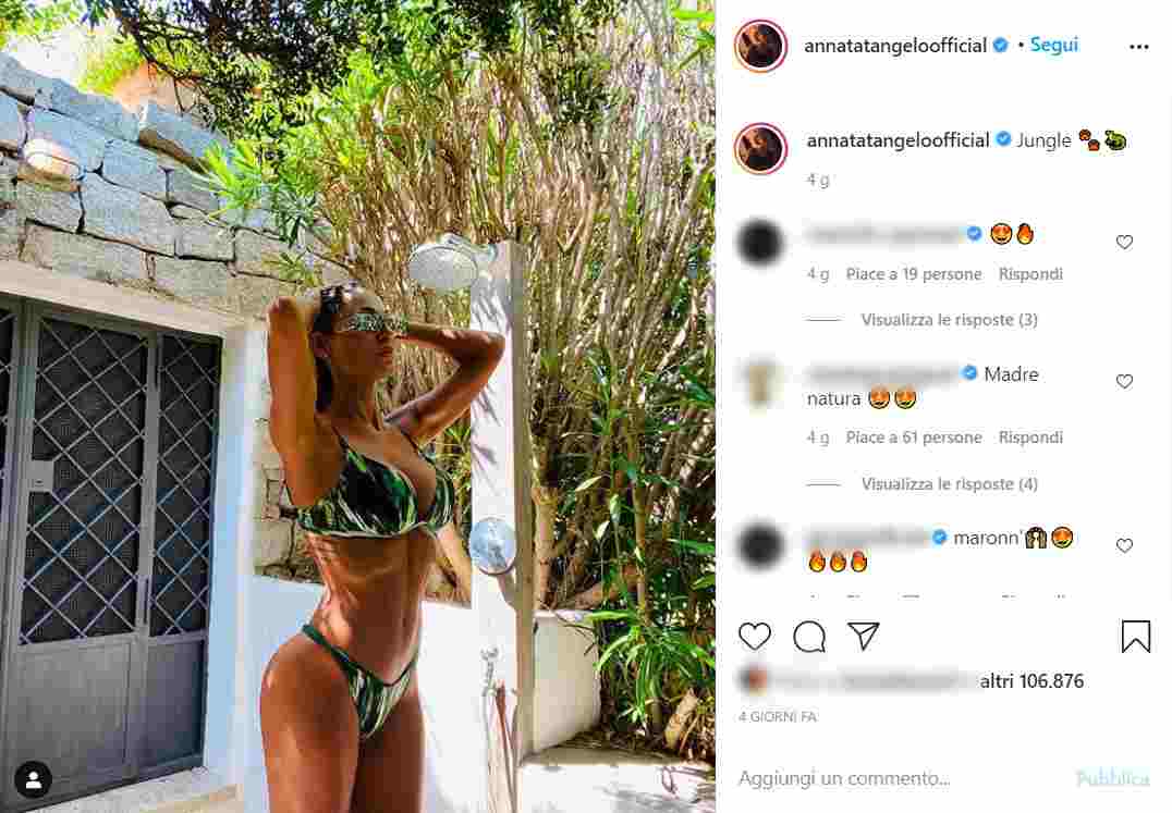 Partiamo subito dal fatto che non di tratta di un selfie ma di una fotografia vera e propria: Anna, abbronzatissima, è in posa come una vera sirena in mezzo alla natura, o meglio, per parafrasare il titolo che la stessa artista ha scelto per suddetto scatto, in una jungle. Immersa in una location da fiaba, non guarda dritta in camera e il suo sguardo è protetto da occhiali da sole. Con indosso un bikini verde, tra l’altro in tinta con la natura, che la attornia, mette in mostra un fisico tonico e muscoloso, assolutamente al top.