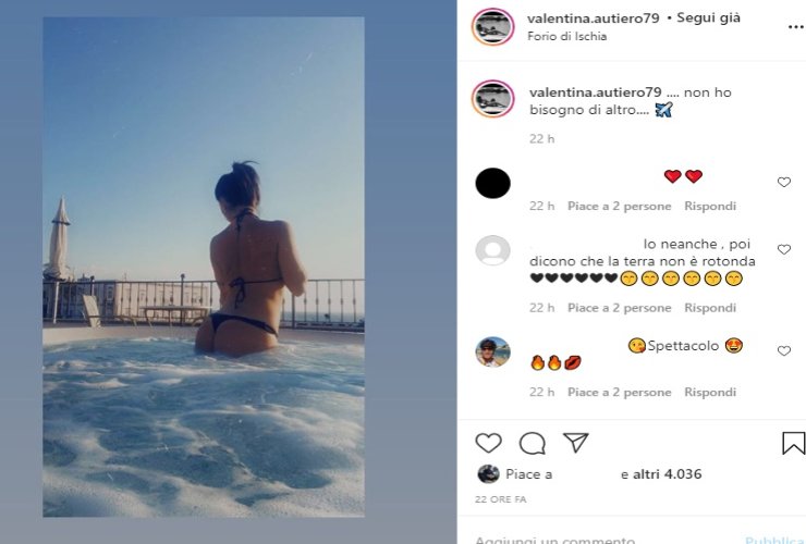 La dama si è appena concessa qualche giorno di relax, prima di organizzare la vacanza insieme alla sua amica e “collega dama” del trono over, Roberta Di Padua. In un post su Instagram, Valentina Autiero ha pubblicato una foto di spalle, in una piscina idromassaggio in cui mostra il suo fisico invidiabile e scrive che non ha “bisogno di altro”. Un appello decisamente a sorpresa per Valentina Autiero.