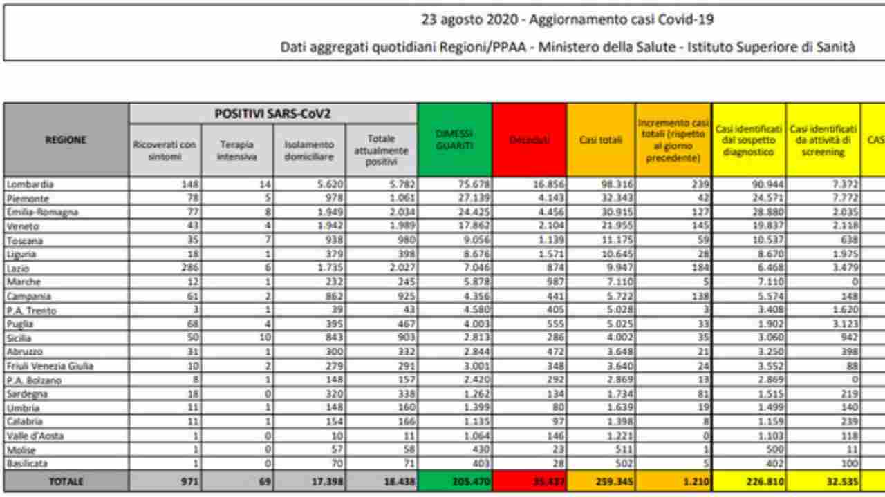 Appena sette sono invece i decessi, con una leggera crescita rispetto alle tre persone morte nele 24 ore precedenti. Per quanto riguarda l’analisi dei dati su scala regionale, la Lombardia torna a indossare la maglia nera, in quanto regione con il maggior numero di casi. Sono ben 239 i nuovi contagiati in terra lombarda, contro i 184 nuovi casi fatti segnare dal Lazio, regione nella quale continuano a tornare soggetti che hanno contratto il Covid-19 in vacanza. A completare il podio ci pensa il Veneto con 145 nuovi casi di contagio.