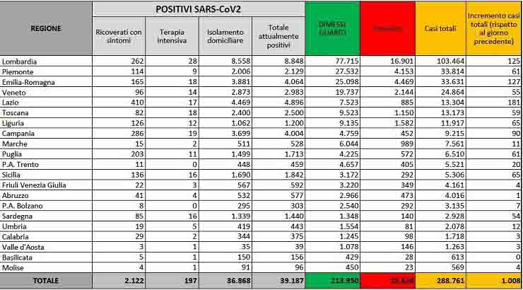 Secondo i dati del ministero della Salute, ci sono 39.187 persone attualmente positive, 678 in più rispetto a ieri: di queste, 2.122 sono ricoverate nei reparti ordinari (+80), 197 nelle terapie intensive (+10) e 36.868 in isolamento domiciliare (+588). È invece di 316 l’incremento dei dimessi e dei guariti nelle ultime 24 ore, per un totale complessivo di 213.950.
