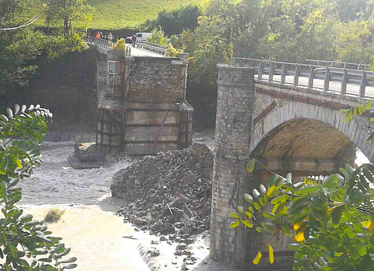 Il ponte Lenzino di Corte Brugnatella è crollato. Ha ceduto l’intera campata centrale, che si è sbriciolata nel fiume Trebbia