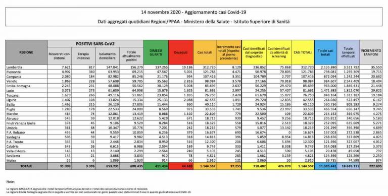 Il bollettino del ministero della Salute di oggi 14 novembre con gli aggiornamenti riguardanti i casi di Covid-19 in Italia.Oggi dichiara un incremento di nuovi contagi di 37.255, i tamponi effettuati sono 227.695. I decessi sono 544.