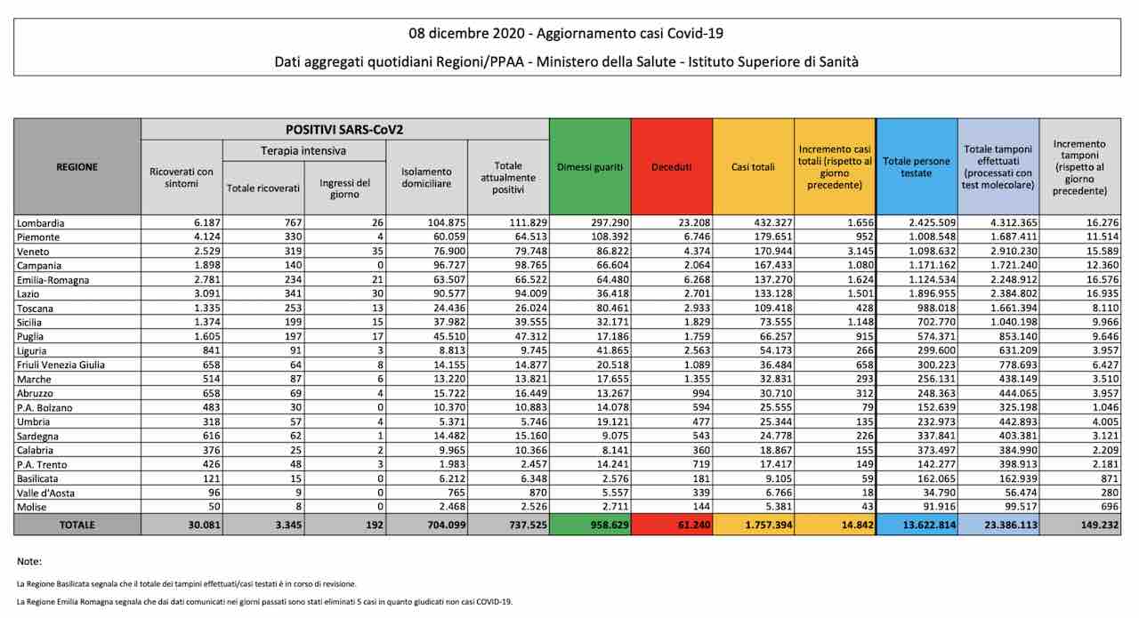 Il bollettino del ministero della Salute di oggi 8 dicembre con i dati riguardanti l’epidemia di Covid-19 in Italia. I primi aggiornamenti dalle Regioni.