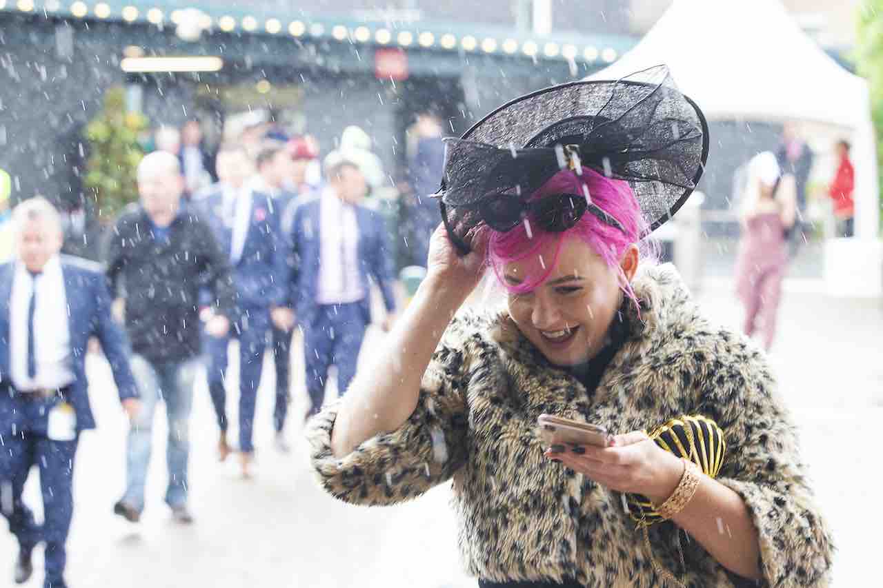 MELBOURNE, AUSTRALIA - OCTOBER 26: Racegoers arrive at the track as rain starts during Cox Plate Day at Moonee Valley Racecourse on October 26, 2019 in Melbourne, Australia. (Photo by Jenny Evans/Getty Images)