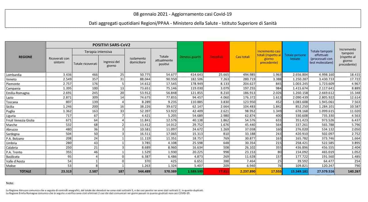 Il bollettino del ministero della Salute di oggi 8 gennaio con i primi dati riguardanti l’epidemia di Covid-19 in Italia.