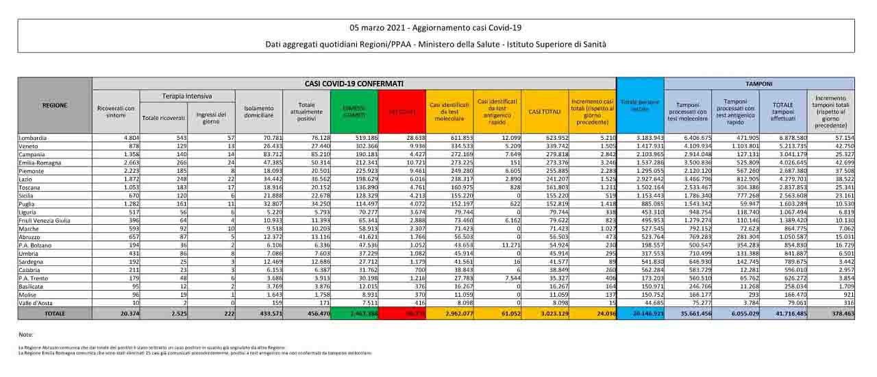 Il bollettino del ministero della Salute di oggi 5 marzo, con i dati riguardanti l’epidemia di Covid-19 in Italia.