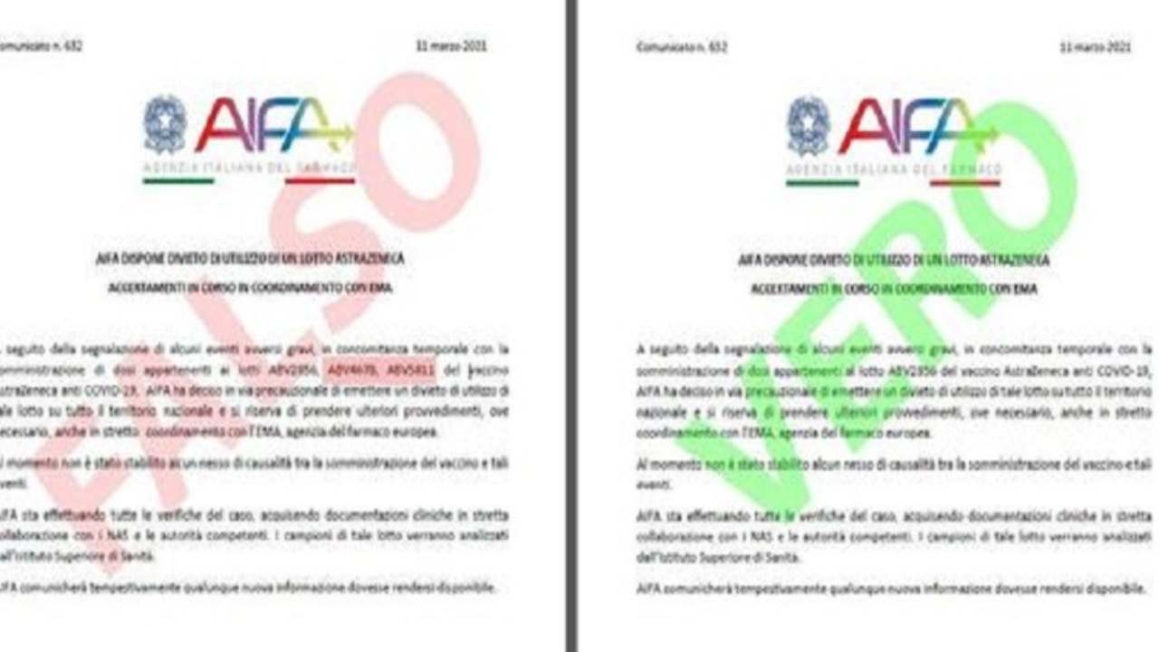 Sul web sono in circolazione, inoltre, finti sms e un falso comunicato dell’Aifa in cui «viene fatto divieto di utilizzo di diversi lotti di vaccino AstraZeneca contro il Covid-19. L’Agenzia Italiana del Farmaco ha smentito la notizia ribadendo che l’unico lotto di vaccino AstraZeneca oggetto del divieto d’uso sul territorio nazionale è il numero ABV2856. Si ricorda che le uniche informazioni e comunicazioni attendibili, riguardanti la campagna vaccinale in atto contro il Covid-19, sono quelle reperibili sul sito ufficiale dell’Agenzia Italiana del Farmaco www.aifa.gov.it».