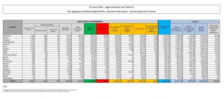 Il bollettino del ministero della Salute di oggi, 25 marzo, dichiara 23.696 contagi, 460 decessi. Sono 349.472 i tamponi molecolari e antigenici per il coronavirus effettuati nelle ultime 24 ore in Italia. Ieri i test erano stati 363.767. Il tasso di positività è del 6,8% (ieri era al 5,8%), in aumento dell’1%.