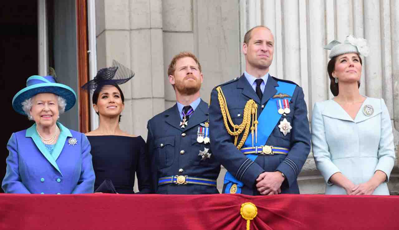 LONDON, ENGLAND - JULY 10: Queen Elizabeth II, Meghan, Duchess of Sussex, Prince Harry, Duke of Sussex, Prince William Duke of Cambridge and Catherine, Duchess of Cambridge watch the RAF 100th anniversary flypast from the balcony of Buckingham Palace on July 10, 2018 in London, England. (Photo by Paul Grover - WPA Pool/Getty Images)
