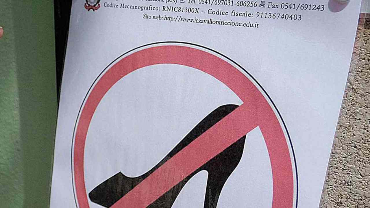 In un istituto comprensivo, lo Zavalloni di Riccione, hanno affisso un cartello di divieto di tacchi. Il dirigente scolastico, Nicola Tontini, dopo 6 anni ha scelto di inserire il suddetto divieto tra le prescrizioni per lo staff della scuola. «Nessun tentativo di censurare le insegnanti, le collaboratrici scolastiche, le madri. Nessuna imposizione modaiola. Ma solo il frutto di una serie di considerazioni pratiche: la scuola è popolata anche da lavoratori, collaboratori, insegnanti, e quel cartello è per ricordare che ci sono anche dei pericoli, e non avere calzature adeguate può comportare problemi».