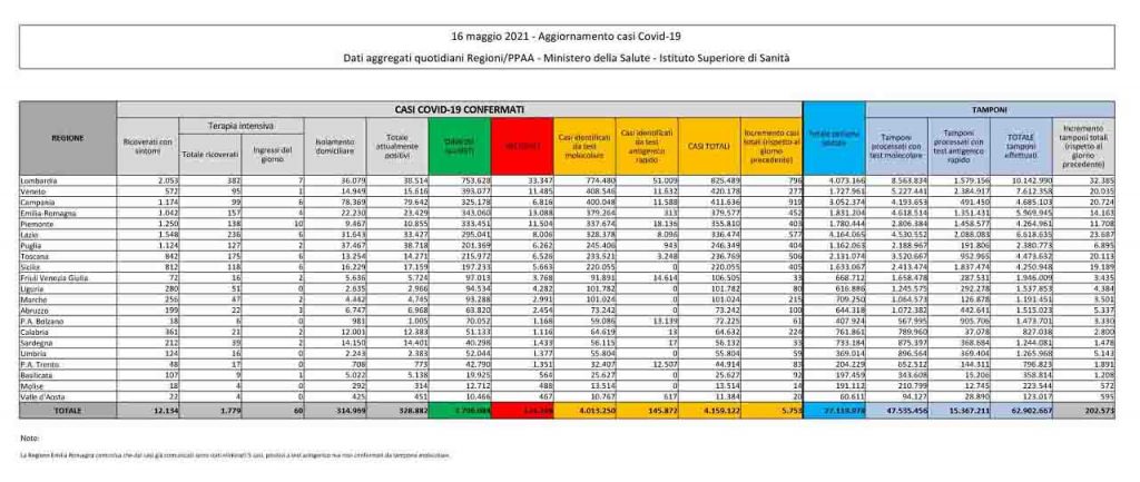 Il bollettino del ministero della Salute di oggi, 16 maggio, dichiara 5.753 contagi, 93 decessi. Le 93 vittime per Covid registrate nelle ultime 24 ore rappresentano il dato più basso da sette mesi. Lo scorso 20 ottobre furono infatti 89 mentre il giorno dopo se ne registrarono 127. Sono 202.573 i tamponi molecolari e antigenici per il coronavirus effettuati nelle ultime 24 ore in Italia, secondo i dati del ministero della Salute. Ieri i test erano stati 294.686. Il tasso di positività è del 2,8%, stabile rispetto al 2,2% di ieri.