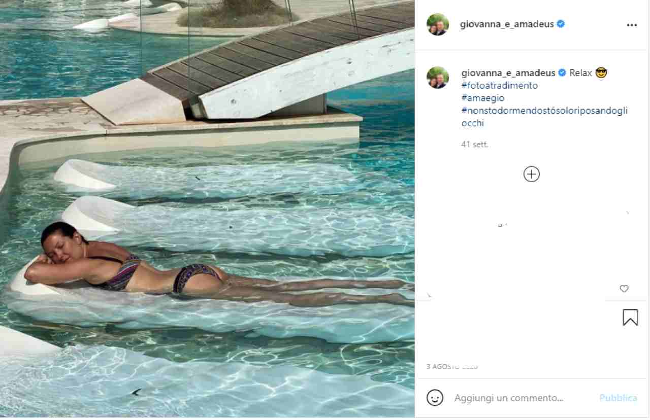 Come si fa del resto a non essere gelosi di una moglie così bella? Tempo fa Giovanna Civitello ha condiviso uno scatto sul profilo Instagram, che condivide proprio come Amadeus ( giovanna_e_amadeus) con all’attivo ben 421mila follower, in cui appare molto sensuale. La ballerina infatti si presenta sdraiata in piscina, a pancia in giù, con il lato b in bella mostra.