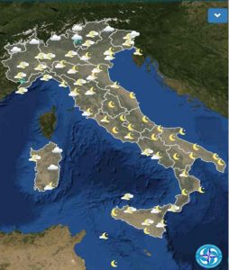 Molte nubi sulle aree alpine, prealpine ed appenniniche con deboli rovesci o locali temporali, in graduale assorbimento serale sui relativi rilievi centrorientali; altrove cielo inizialmente sereno o velato ma con annuvolamenti cumuliformi più significativi accompagnati da brevi rovesci temporaleschi, attesi tra mattina e pomeriggio anche sulle zone pianeggianti e pedemontane di Piemonte, Lombardia ed Emilia.