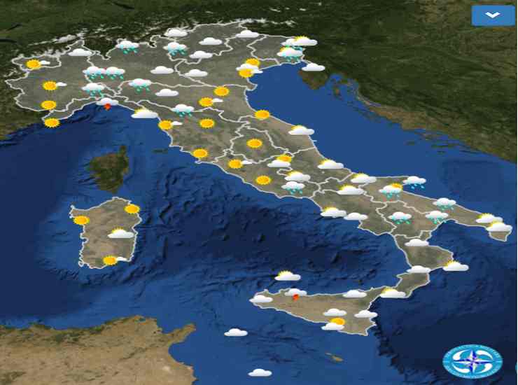 Maltempo su Campania e Sicilia con rovesci e temporali localmente intensi, in parziale riduzione dalle ore serali; sul restante meridione iniziale cielo sereno o velato, ma con sensibile aumento della copertura atteso dal pomeriggio su Basilicata tirrenica, Calabria e puglia salentina con rovesci e locali temporali associati.