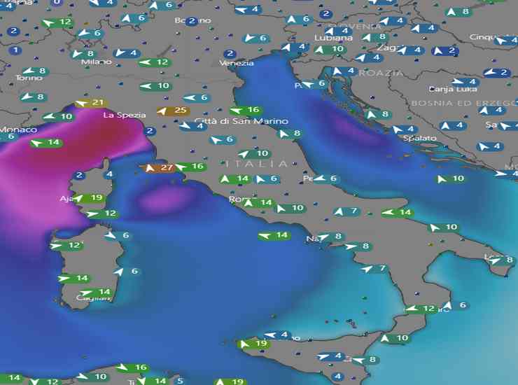 Molto mosso il mar ligure; da mossi a molto mossi mar e canale di Sardegna, tirreno ed adriatico centrosettentrionali, e stretto di Sicilia; da poco mosso a mosso lo ionio; mossi i restanti bacini.