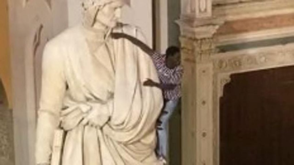 Notte agitata a Firenze, in piazza Santa Croce, dove già la mala movida crea diversi problemi a uno dei luoghi simbolo cittadini, nella notte tra sabato 30 e domenica 31 ottobre un ragazzo senegalese, probabilmente ubriaco, si è arrampicato sulla statua di Dante.